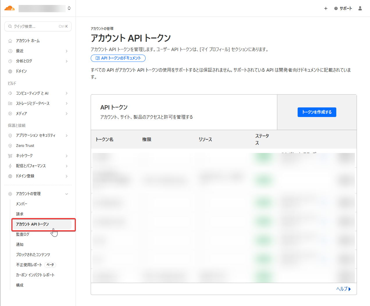 ダッシュボードのサイドバーのアカウントの管理 → アカウントAPIトークン を開き