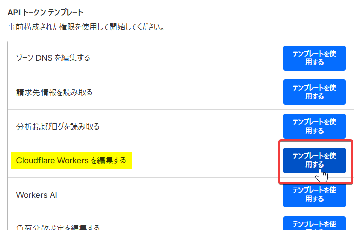 APIトークンテンプレートから「Cloudflare Workersを編集する」のテンプレートを使用する。