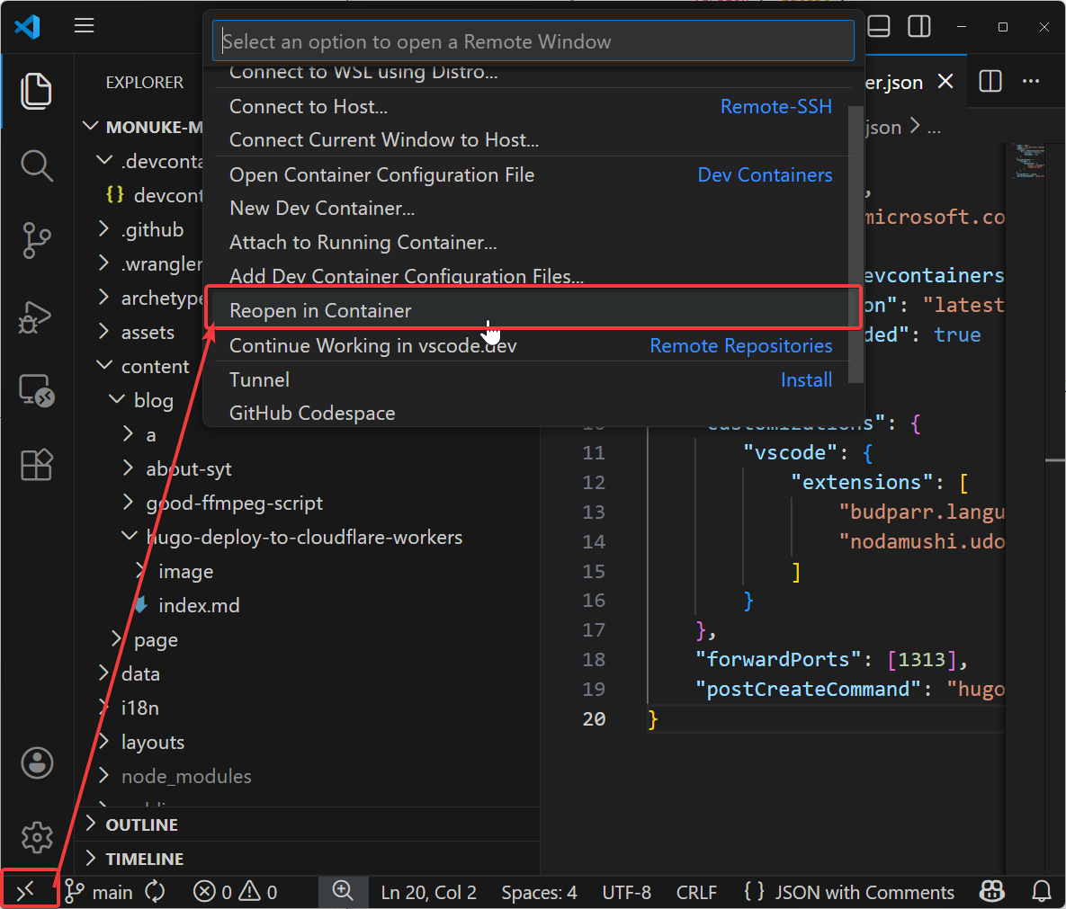 左下にある「><」をクリックし、「Reopen in Container」をクリックします。